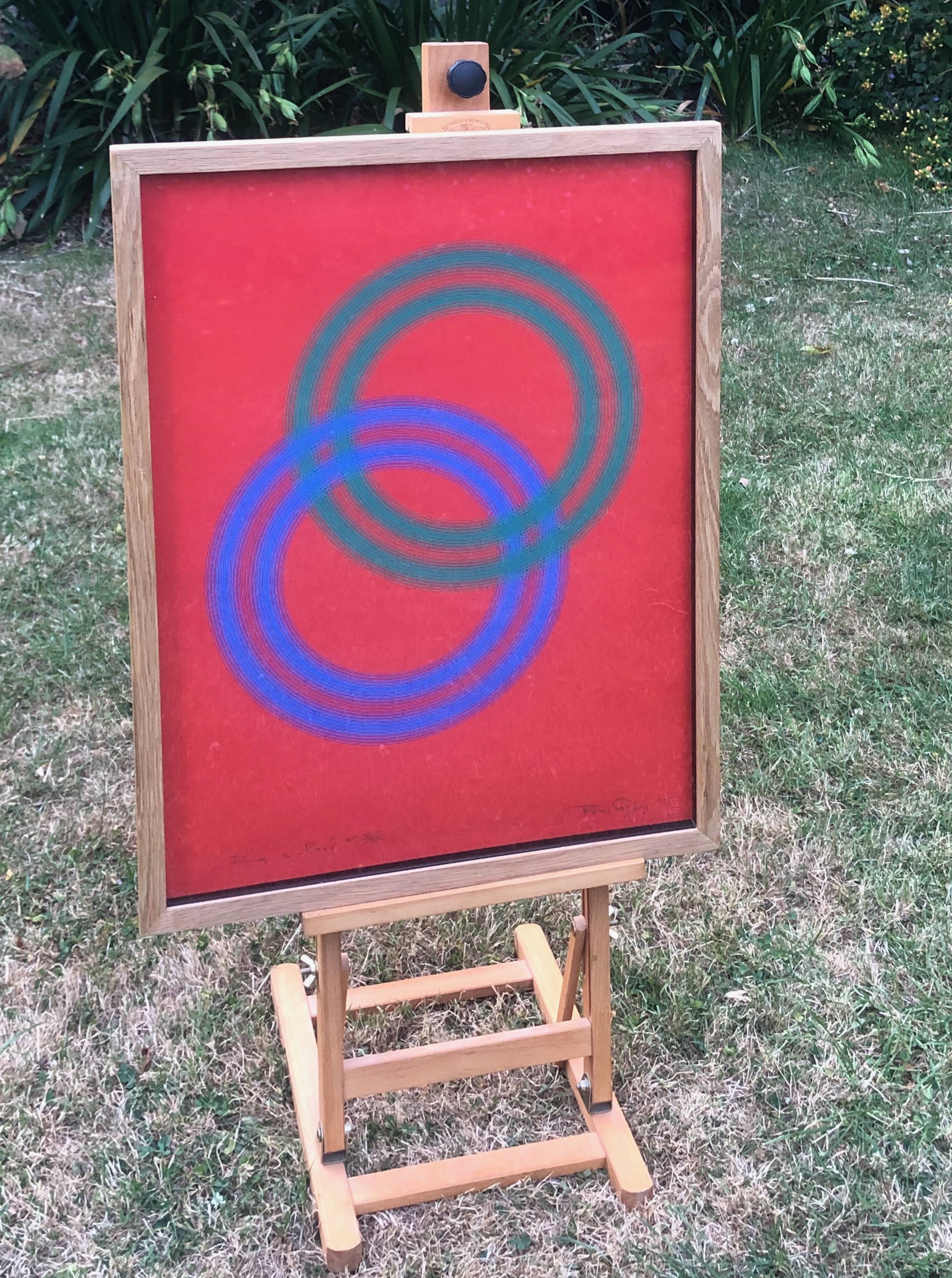 Peter Sedgley has been described as ‘one of the most single-minded of artists’. After abandoning his career as an architect, he devoted himself to the exploration of colour relationships. Like other members of the emerging Op art movement of the 1960s, Sedgley was fascinated by optical sensations produced by intricate geometric patterns and pulsating colour contrasts. In 1964 he began to concentrate on concentric rings of colour. He describes the circle as ‘anonymous’ because it is a familiar and homogeneous shape. In the Looking Glass Series, Sedgley plays with the ambiguous relationships of figure and ground, creating a dizzying visual experience through the optical illusion of movement. Contributor to Chelsea Arts Club centenary portfolio. He died in March 2025.