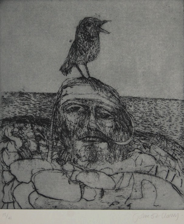 Birds are a frequent motif of Bellany’s work, though they are more often seabirds than the thrush (or robin?) in this wonderful image. The bird perched on the artist’s head is reminiscent of the fishes often shown balanced on the heads of his female subjects.